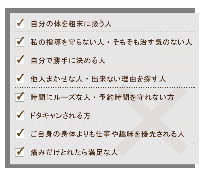 メディカルケア羽曳野治療院は全ての方のご希望に応えることができるような整体院ではなく、以下のような方には向いていません。