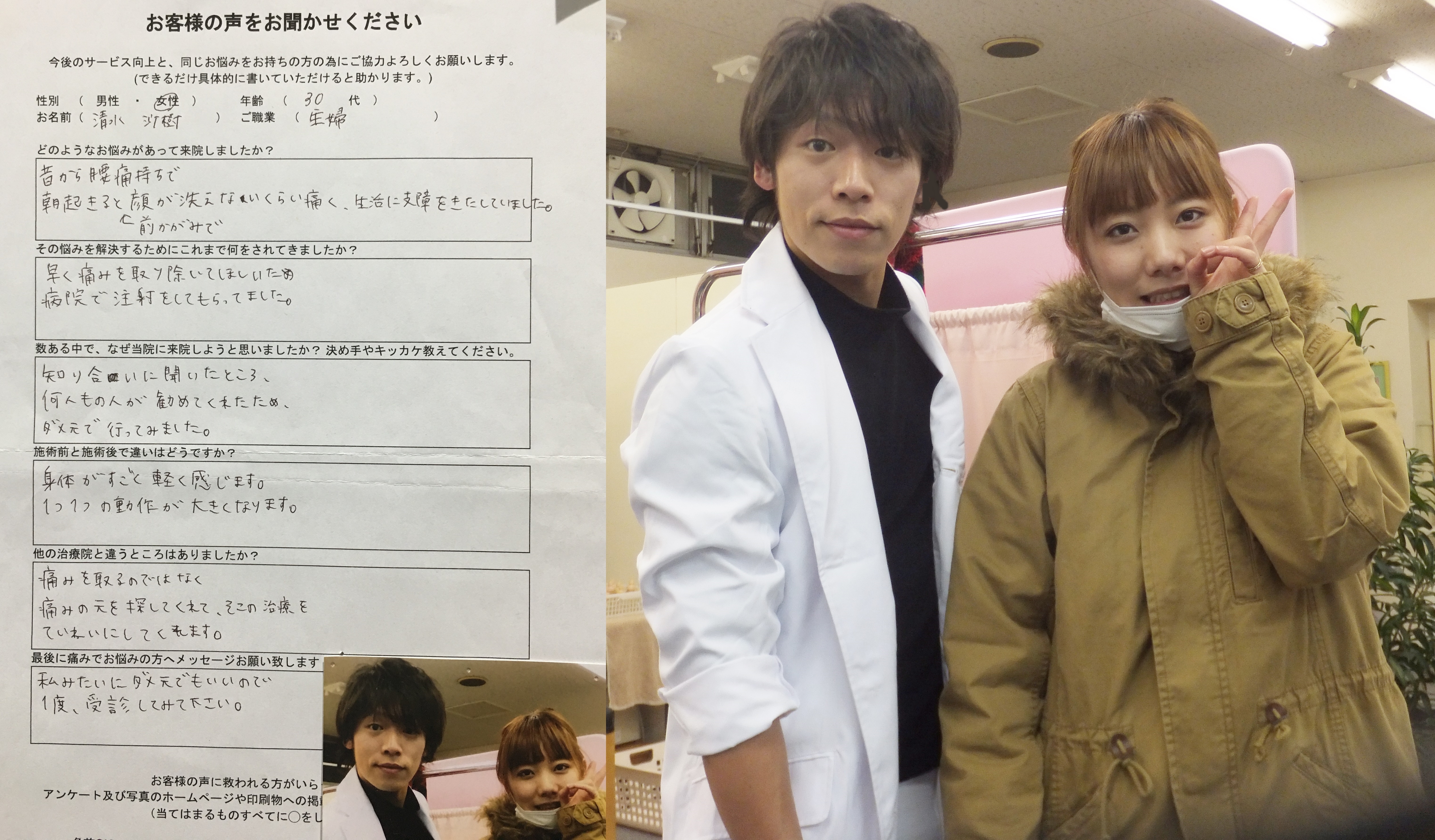 10代の頃から腰痛があり、去年ヘルニアの手術をしたけど完治せず悩んでいました。