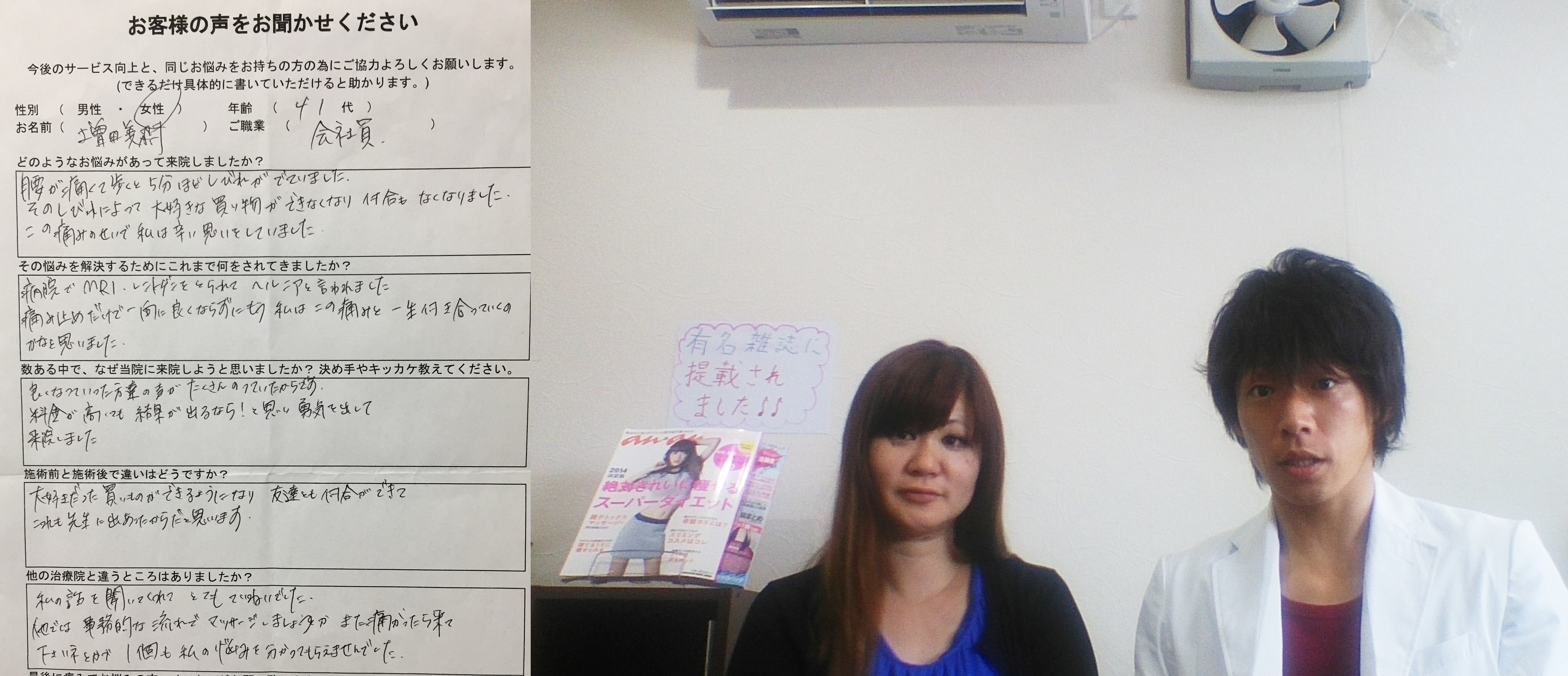 先生からの治療と日常生活における簡単なエクササイズのおかげで今では夜もぐっすり寝れるようになり、イスにも座れるようにもなりました。腰とお尻のつっぱりも楽になりました!