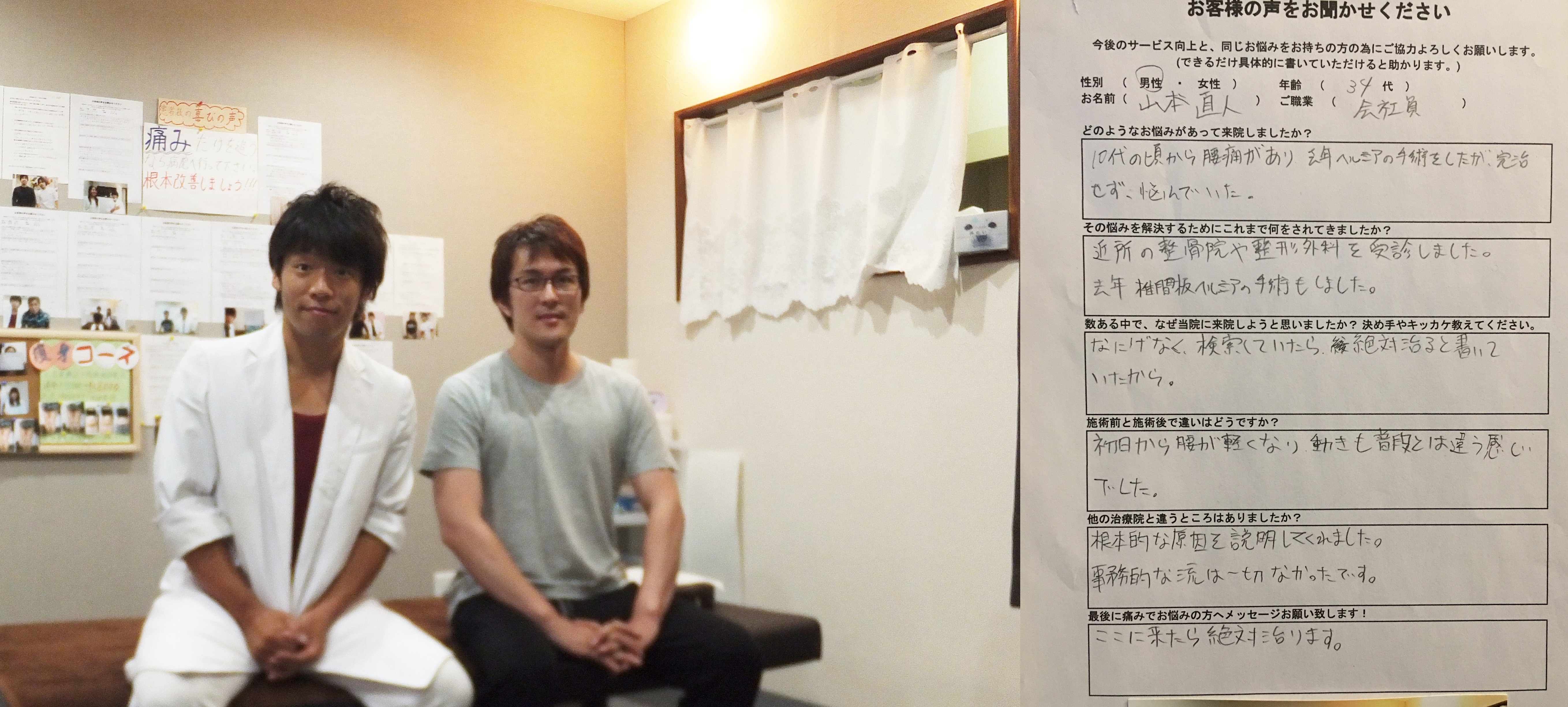 今痛くてどうしていいか分からない人がいると思うんですけど、やはり体を動かさなければもっと悪くなると思うし、正しい動かし方をここに来て先生に学んでその通りにやったら自分は治りました。