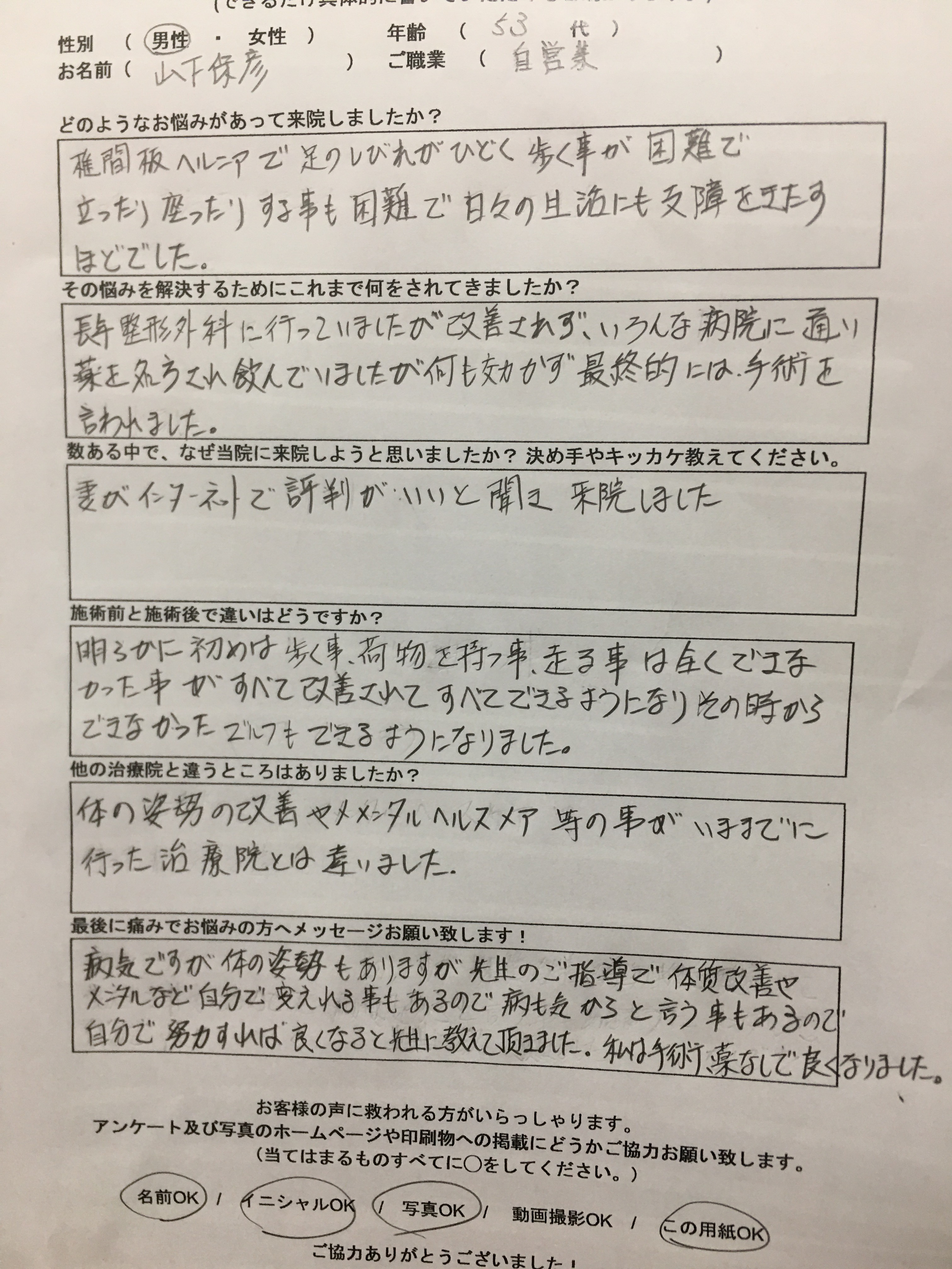 去年ヘルニアの手術をしたけど完治せず悩んでいました。