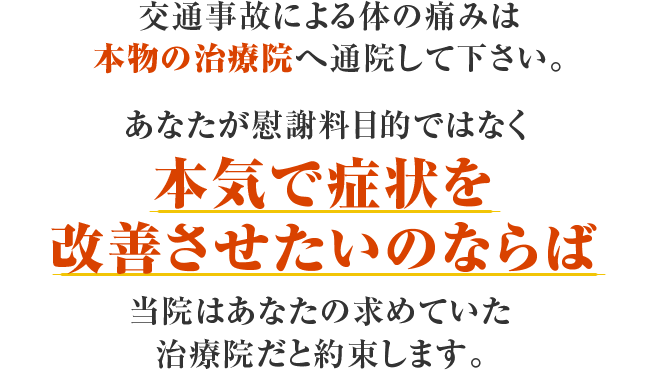 自動車事故後のつらい怪我の痛みについてだけではなく、精神的な不安なども取り除けるように、当院ではトータルサポートをさせていただいております。