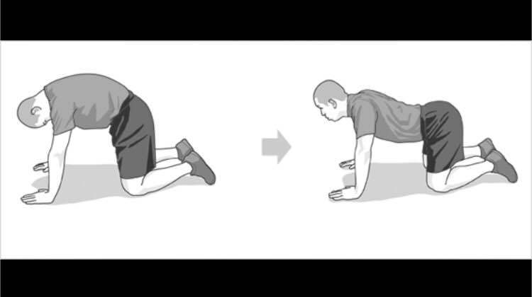 下記の写真のようによつんばいになり背中を丸めて、ゆっくり反る。といった動作をゆっくりと繰り返しましょう。このストレッチをすることで出産前にお腹が大きいために腰の反り続けた負担が蓄積されています。その疲労や硬さを減らすことができるので、無理ない範囲で10回ほどを一日4~5回行ってください。