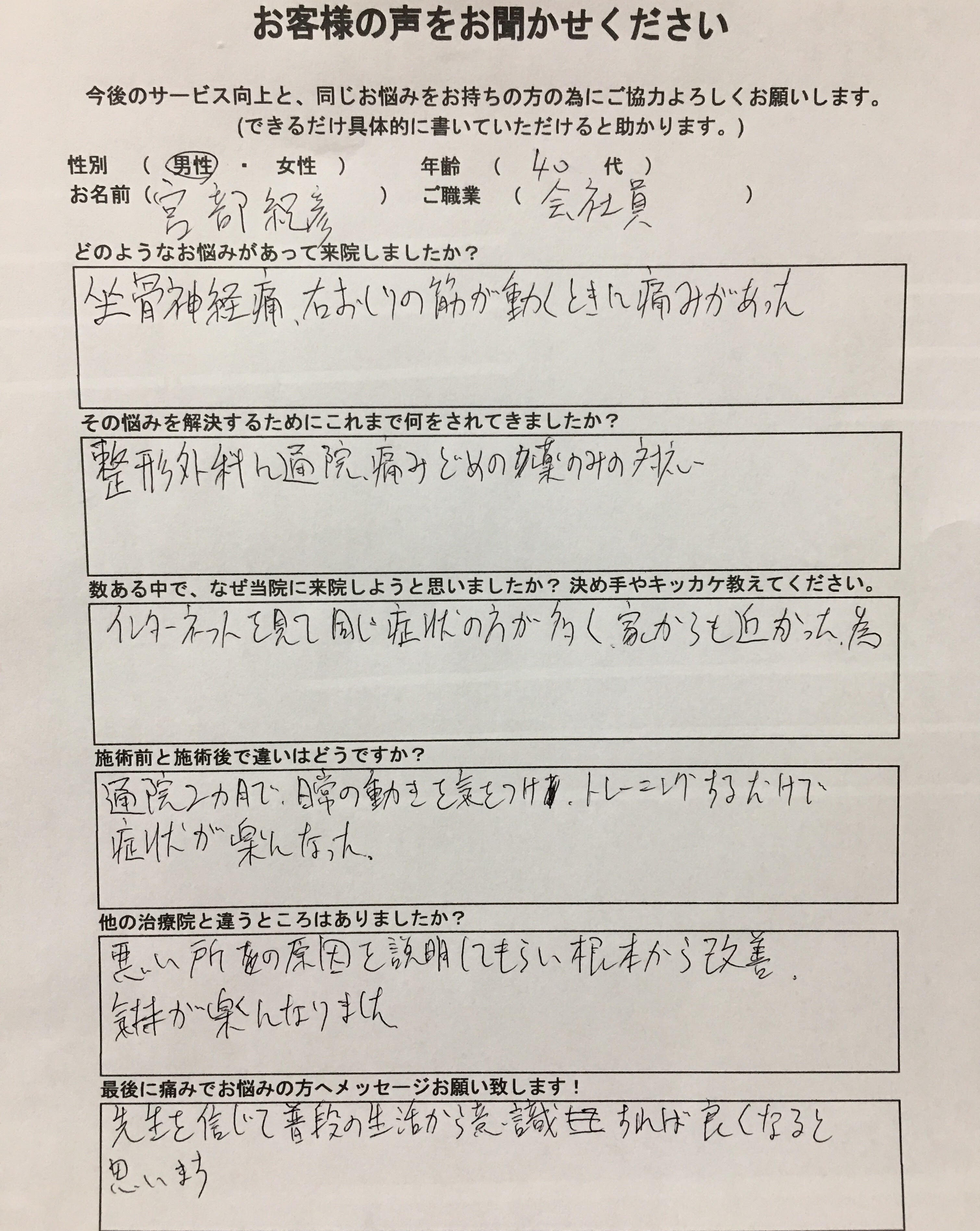 坐骨神経痛(お尻にかけての痛み)で悩まされていた男性の患者様の、実際の事例をご紹介します。
