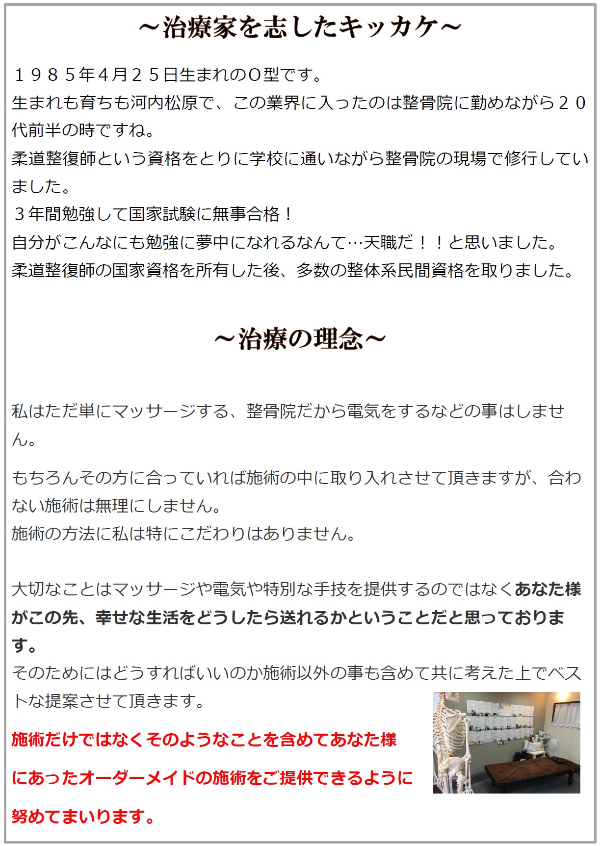 こんにちは、メディカルケア羽曳野治療院の今津嵩之(いまづたかゆき)と申します!