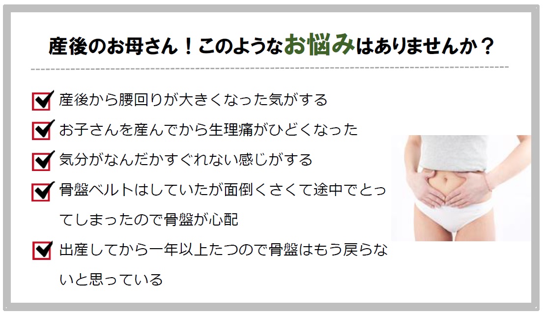 産後の回復時に無理をしてしまうと骨盤が開いてズレたまま固まってしまいます。骨盤がズレていると生理時に月経血がうまく排泄できない事があり、出産前まで痛みがなかった方でも産後に生理痛がでてきたという方もいらっしゃいます。