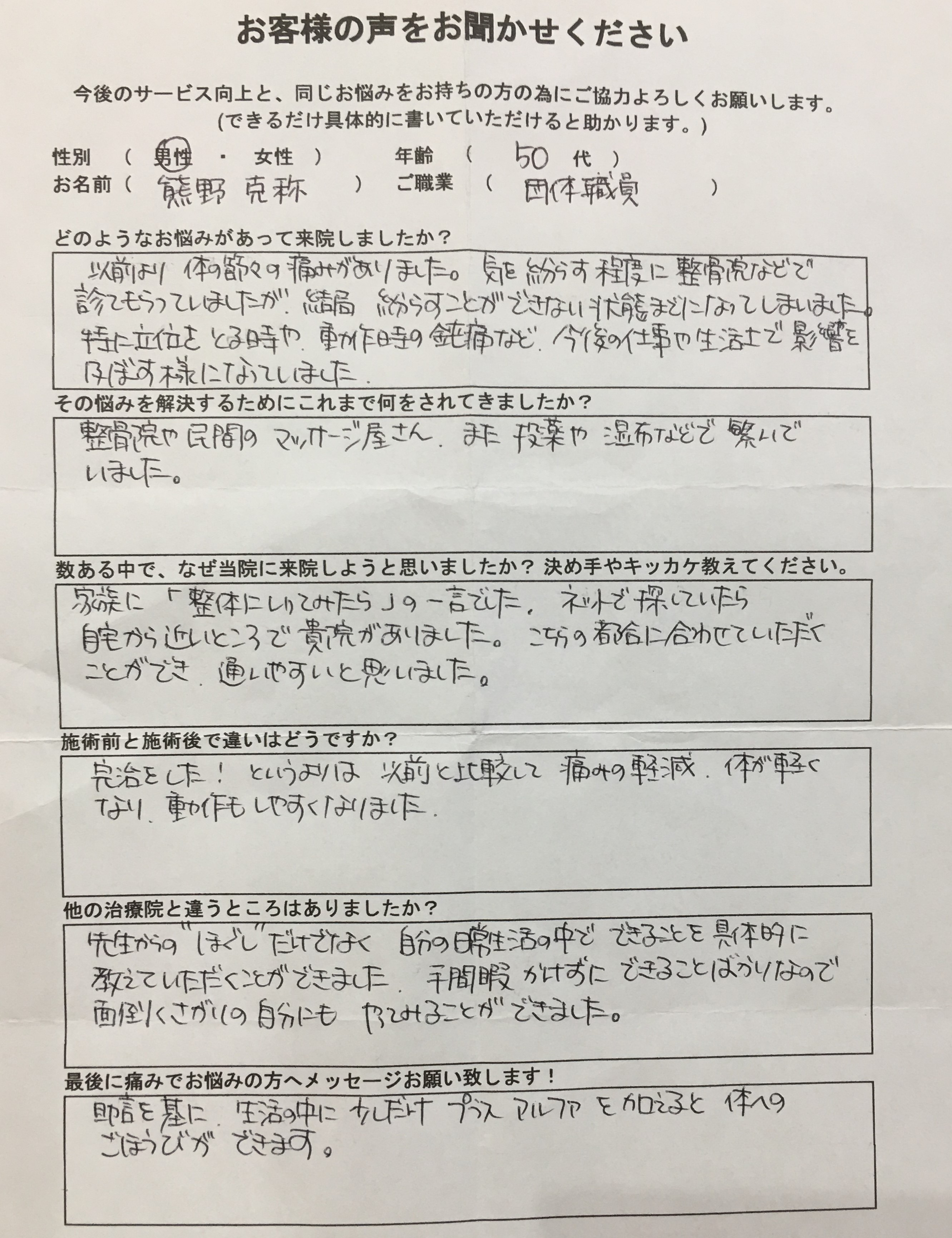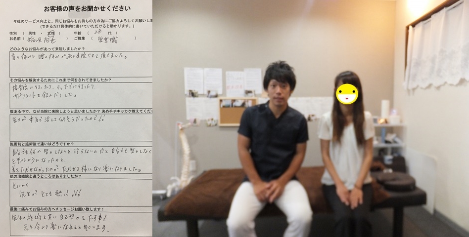 今まで行ってた整骨院ではほぼマッサージだけでしたが、ここではカウンセリング、検査、説明などがきっちりされていて治る、良くなる希望が見えました。