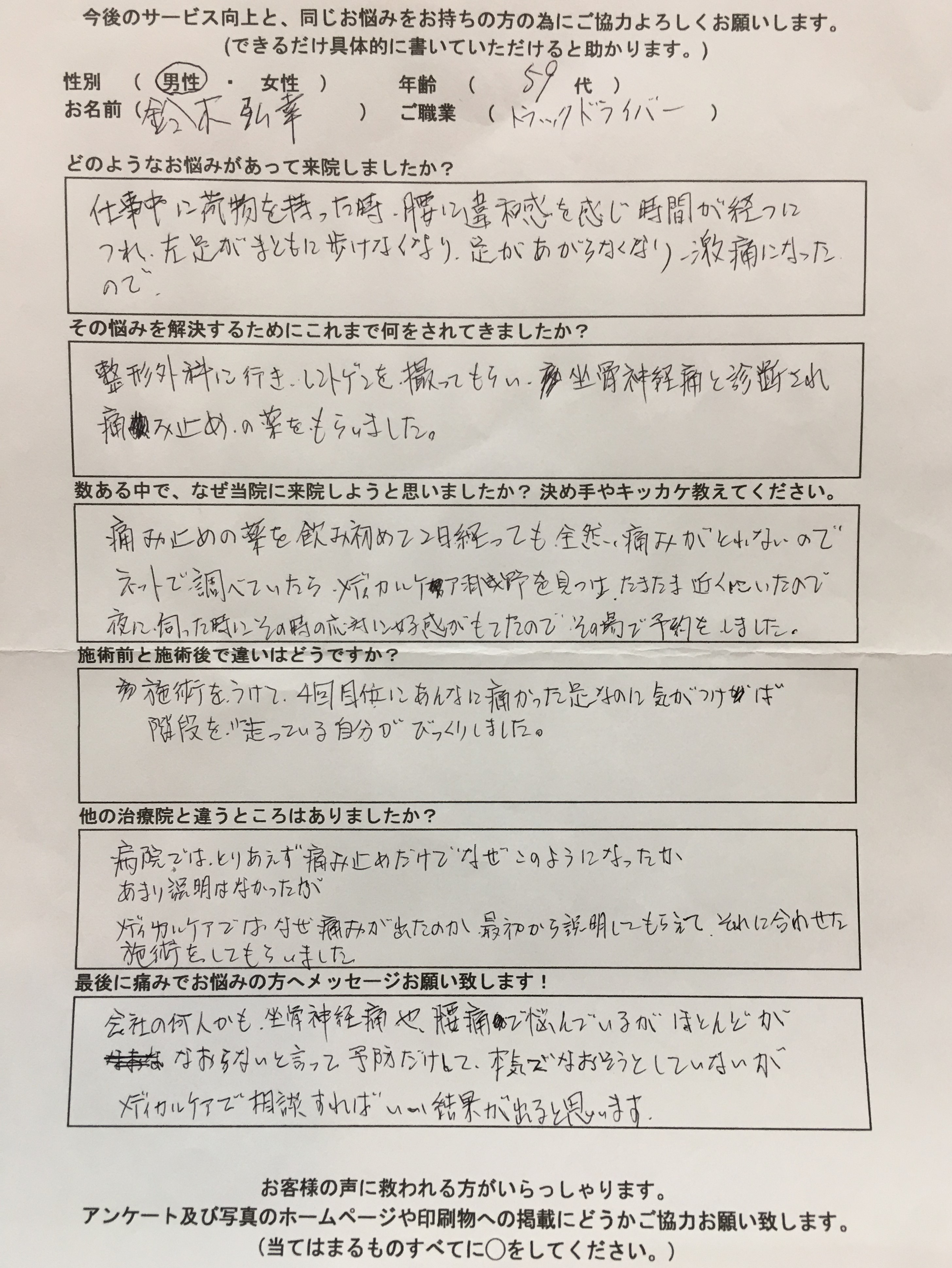坐骨神経痛のひどい痛みとしびれが完全に消えました